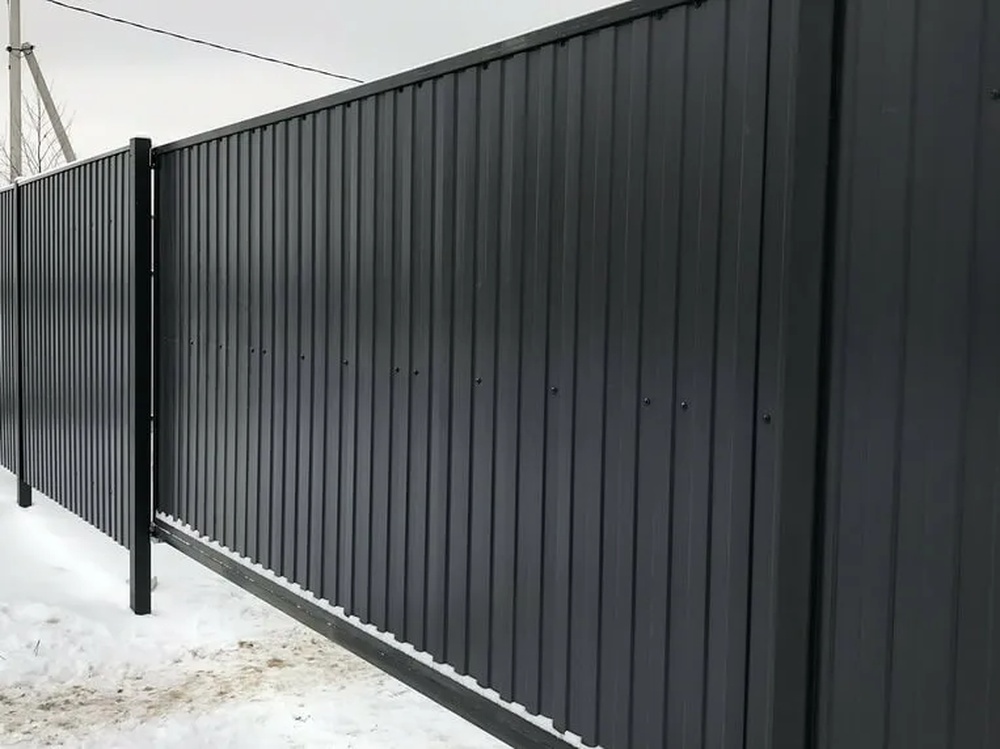 Особенностью является двустороннее покрытие в цвете серый графит, что позволяет использовать материал с обеих сторон без потери эстетики. Толщина 0,45 мм балансирует между легкостью и прочностью, делая профлист подходящим для временных и постоянных конструкций. Он устойчив к перепадам температур от -50°C до +80°C, что актуально для российского климата. Кроме того, материал не впитывает влагу и легко очищается от загрязнений.